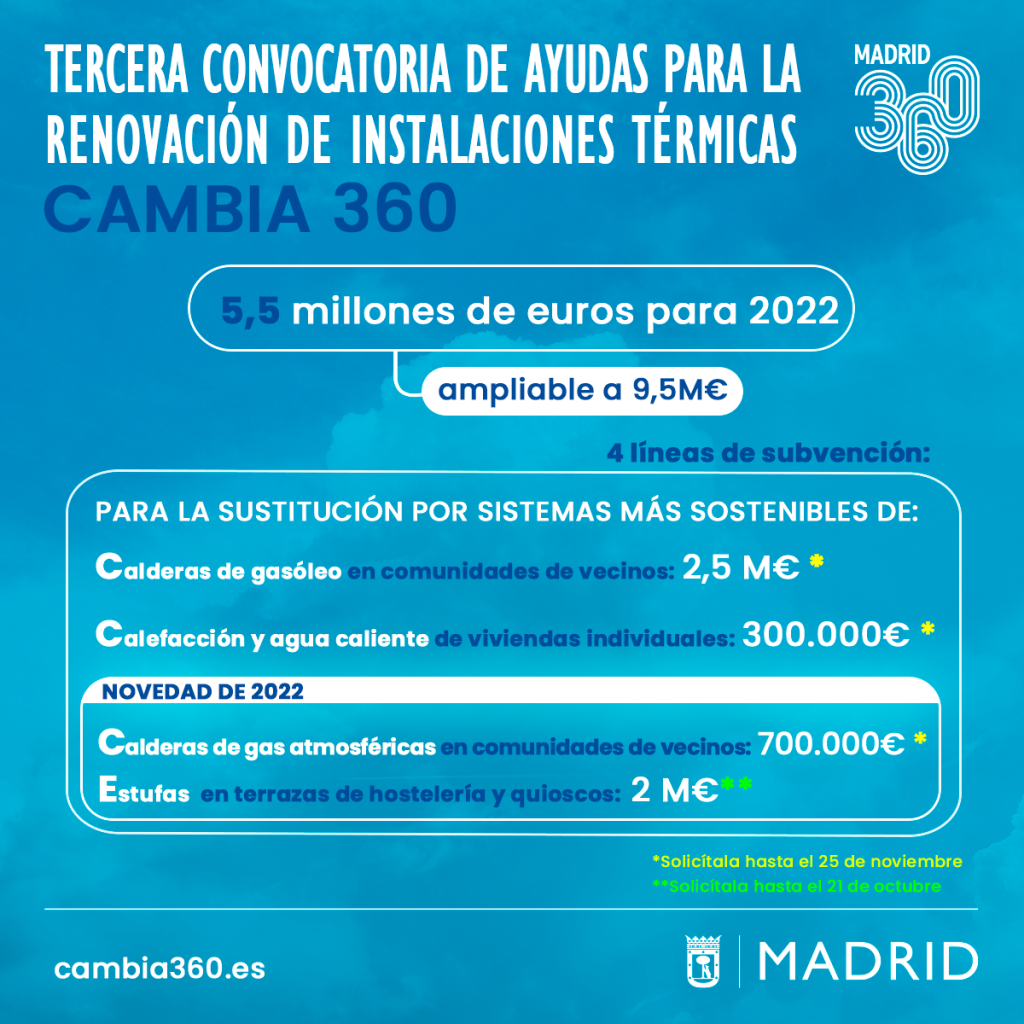 Las ayudas Cambia 360 para fomentar la instalación de sistemas de climatización eficientes en los domicilios y empresas y las subvenciones para eliminar las estufas contaminantes de las terrazas de los negocios de la hostelería madrileña ya están disponibles. El plazo de solicitud se abrió el pasado 26 de abril de este año y permanecerá abierto hasta el 21 de octubre para las subvenciones de terrazas y hasta el 25 de noviembre para el resto de créditos.