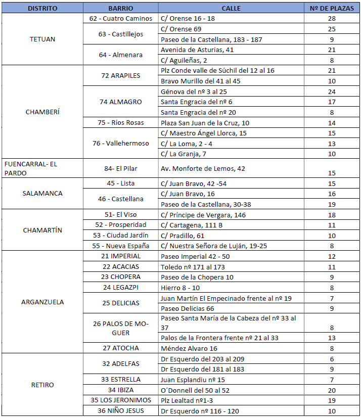 Inicialmente, estas 491 plazas de alta rotación se ubicarán en Chamberí (132 plazas); Tetuán (91); Arganzuela (85); Retiro (71); Salamanca (50), Chamartín (47), y Fuencarral-El Pardo (15). En total, 26 barrios que se beneficiarán de esta medida que se irá implantando a lo largo del primer semestre de este año en la ciudad hasta llegar a las 1.130 plazas.