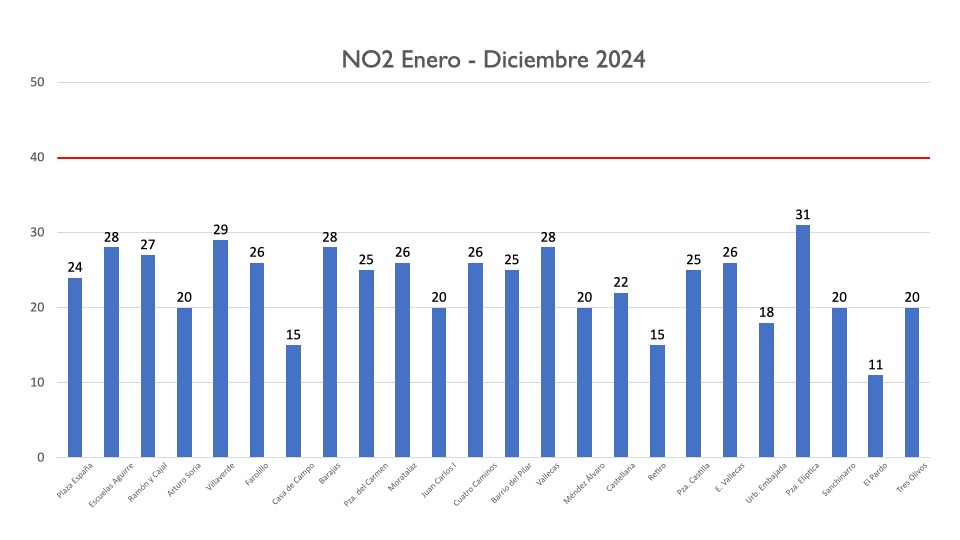 En 2024, ninguna de las 24 estaciones de la red ha superado los 31 microgramos por metro cúbico (μg/m3).