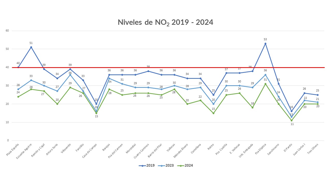 Desde el año 2010 y hasta 2021 se superaron los niveles de dióxido de nitrógeno (NO2) establecidos en el Valor Límite Anual de la directiva, cuyo máximo fija en 40 microgramos por metro cúbico (μg/m3). En la última década, el peor año de calidad del aire fue 2017, cuando se superó este límite en 15 de las 24 estaciones de calidad del aire que tiene el municipio. En 2018, último año de referencia incluido en la sentencia condenatoria del Tribunal de Justicia europeo a España por los reiterados incumplimientos de Madrid, Barcelona y Bajos del Llobregat desde 2010, se rebasó en 7. En 2019, en 2.