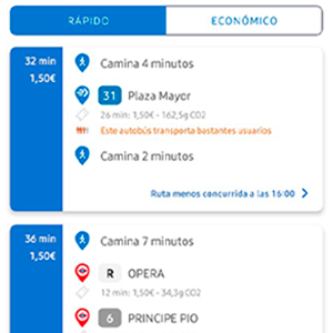 Aúna información de autobuses urbanos de EMT, Metro, Metro Ligero, Cercanías o autobuses interurbanos e integra opciones de movilidad compartida como bicicletas, patinetes, coches o motos