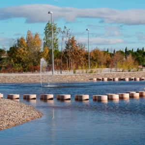 En su zona acuática, presenta aspecto de lago y unas formas geométricas que, por su diseño, evidencian seis plazas principales bordeando todo el árbol: tres de ellas son eminentemente paisajísticas, recreando en cada plaza un aspecto similar al de jardín japonés, sobrio y elegante, y las otras tres plazas tienen varios espacios para distintos usos: mesas de picnic, zonas de ejercicios para personas mayores y diversos equipamientos.