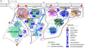 El parque cuenta con cuatro colinas con nombre propio: la colina sobre ruedas, que es la zona destinada a distintas prácticas deportivas asociadas a ruedas (bicicletas, skate); la colina del viento, espacio libre dedicado a los apasionados del vuelo con cometas; la colina del reciclaje, donde los neumáticos que rodeaban el entorno han tomado forma de mobiliario para aprender a valorar y cuidar lo que nos rodea y pertenece a todos. Esta colina pretende aportar un valor único por las connotaciones educativas y los valores ambientales asociados al reciclaje, que son inexistentes en otros espacios lúdicos de la ciudad. La última colina, la del merendero, cuenta con plantaciones de sombra, mesas de picnic y acabado de suelo en terrizo y crea un espacio estancial agradable en el que disfrutar de un día al aire libre.