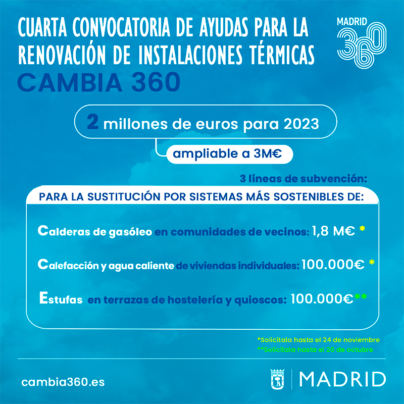 Vuelven las ayudas Cambia 360 para eliminar las calderas de gasóleo y las estufas contaminantes en la ciudad de Madrid. El plazo para tramitar las solicitudes se abre el 24 de marzo y permanecerá activo hasta el 24 de octubre para los establecimientos hosteleros, y hasta el 24 de noviembre para renovar calderas de gasóleo y generadores de calor con combustibles fósiles en edificios residenciales.